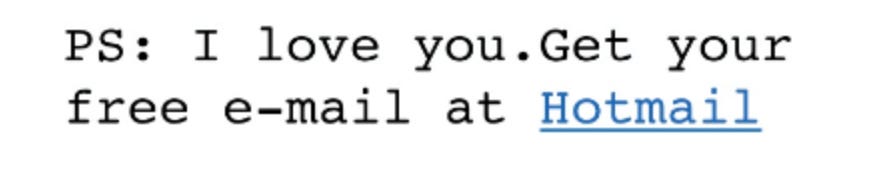 When Hotmail was launched in 1996, they implemented a clever marketing tactic that helped attract new users. They added a simple tagline at the bottom of each outgoing email sent through their service, which said, "PS: I love you. Get your free email at Hotmail."